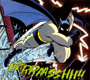 Die Sache hat natürlich ihren Ursprung bei der Fledermaus, die laut Frank Miller nicht – wie noch bei Bob Kane – durchs offene Fenster hereingeflogen kam, sondern bei einem Gewitter durchs Fenster brach. (Noch so ein Aspekt, der den Glasbruch begleitet: Blitz und Donner – aber dazu später mehr.) Man muss sich fragen, wie glaubwürdig das ist. Wie groß und schwer muss eine Fledermaus sein, wie schnell muss sie fliegen, um selbst eine einfach verglaste Scheibe zu durchbrechen? Zoologen werden jetzt sagen: Das spielt keine Rolle, eine Fledermaus müsste die Scheibe orten können, daher ist es gar nicht möglich, dass sie dagegenfliegt. Es sei denn – sie ist taub.