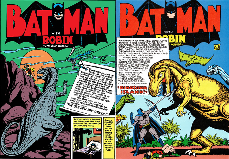 Batman gegen Dinosaurier ← Vorherige „The Isle that Time Forgot“ & „Dinosaur Island“ (Batman #10/35, 1942-1946) Batman mit Pfeil und Bogen gegen Dinosaurier
