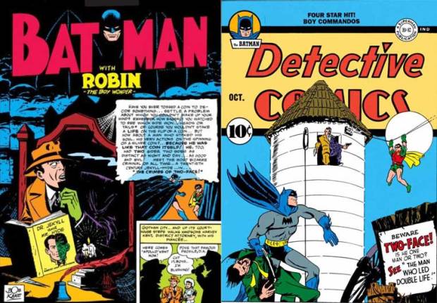 Es ist bemerkenswert, wie gut die Figur durchdacht ist, von Anfang an ist alles da: der Staatsanwalt, der vom Gangster Moroni im Gerichtssal Säure ins Gesicht geschüttet bekommt, die Entfremdung von seiner Frau Gilda, der Doppelkopf-Dollar, die für ihn die Entscheidungen trifft. Die Münze ist zunächst ein Beweisstück gegen den Moroni. Weil Two-Face sie für sein Unglück verantwortlich macht, zerkratzt er sie mit einem Skalpell und widmet sein Leben einer Obsession für die Dualität: Sein Versteck ist zweigeteilt, seine Verbrechen haben stets mit der Zahl zwei zu tun: ein Doppeldecker-Bus, ein Double-Feature-Kino. Doch wenn die Münze auf die unversehrte Seite fällt, spendet er seine Beute auch für wohltätige Zwecke. Es ist noch Gutes in ihm …