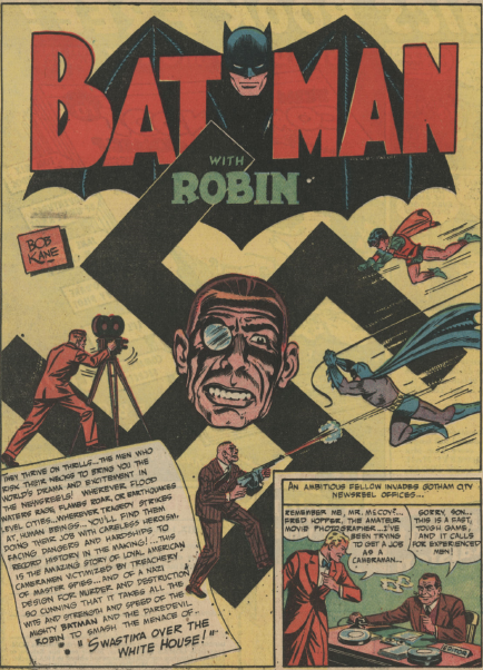 Seltsamerweise weist das Cover zu Batman #14 keinen Kriegsbezug auf, stattdessen sieht man den Pinguin. In einer der Geschichten wird schon im Titel „Swastika Over the White House“ das Schlimmste heraufbeschworen. Ein junger deutscher Spion namens Fritz Hoffner gibt sich als Reporter aus, um insgeheim Informationen über US-Militäranlagen zu sammeln und Sabotage-Akte zu verüben. Er berichtet an einen gewissen Count Felix, der sich in einem Antiquitätenladen versteckt und Monokel und Undercut trägt. Über ihm schwebt eine Deckenlampe in Form eines Hakenkreuzes. Die Schurken sprechen eine seltsame Mischform aus schlechtem Englisch und Pseudo-Deutsch („Himme! It iss too late! Step on der Gas!“).