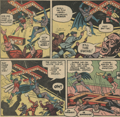Beim dritten Mal werden Batman und Robin jedoch von den Nazis überwältigt (das geht erstaulich einfach) und in einem brennenden Auto auf Treibstofftanks losgelassen. Man kann sich denken, was gerade noch in letzter Sekunde passiert. Und da sich die Nazis auch nicht mehr die Mühe machen, nachzusehen, können die beiden Helden den Schurken in ihr Geheimversteck folgen und sie spielerisch überwältigen – indem sie sich am Hakenkreuz-Leuchter durch den Raum schwingen, Teile davon als Wurfgeschoss benutzen und das Ding schließlich auf die Bösen fallen lassen. Symbolträchtiger geht’s wohl kaum: Die Nazis werden sozusagen mit ihrer eigenen Waffe geschlagen.