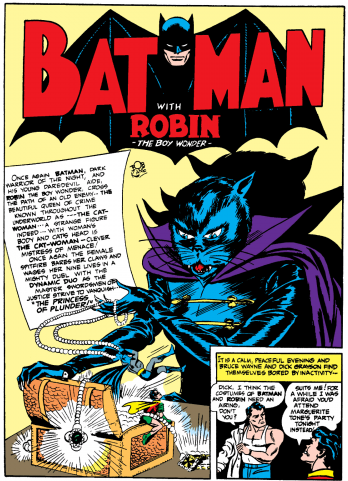 In ihrem vierten Abenteuer trägt Catwoman erstmals eine Kombination aus Violett und Schwarz und stiehlt nicht selbst, sondern lässt ihre Handlanger für sich arbeiten. Und das läuft so: Die wohlhabende Marguerite Tone veranstaltet eine Party, bei der sich die Gäste die Zeit mit einer Schnitzeljagd vertreiben sollen: Jeder Gast ist dazu angehalten, bestimmte Gegenstände zu besorgen. Wie gut, dass Bruce Wayne und Dick Grayson bei diesem öden Unsinn nicht mitmachen und lieber eine Runde als Batman und Robin drehen. Eine günstige Fügung, denn Catwoman macht sich das Spiel zunutze, um ihre Handlanger andere, wertvolle Dinge aus Häusern holen zu lassen.