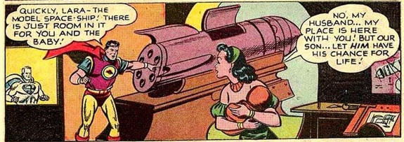 Jetzt wird’s wild: Superman folgt dem Meteoriten ins All. Das geht ganz einfach. Indem er so schnell fliegt, dass er die Zeitbarriere durchbricht (analog zur Schallmauer), so reist er (unsichtbar) dem Brocken hinterher, bis er nach Krypton kommt. Dort sieht er, wie sein Vater Jor-El ihn in eine Rakete steckt, weil der Planet zu explodieren droht. Und er sieht, dass seine Mutter ihn als Kind hätte begleiten können, aber lieber bei ihrem Mann gestorben ist. Superman fragt sich aber nicht, welche Mutter so etwas tun würde, sondern folgt der Rakete zur Erde, wo die Kents ihn finden und adoptieren. Jetzt erst begreift er, dass er selbst von Krypton stammt.