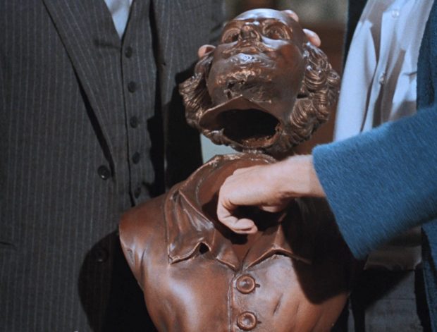 Der beeilt sich, rennt mit seinem Mündel zum Telefon und greift zum Hörer. Doch eigentlich ist das alles unnötig, denn Bruce Wayne tut ohnehin immer dasselbe: Er zieht sich um und fährt zum Polizei-Hauptquartier. Vorher betätigt er einen geheimen Schalter in einer Shakespeare-Büste und hinter einem Bücherregal kommen zwei Stangen zum Vorschein, an denen Bruce Wayne und Dick Grayson hinunterrutschen und zu Batman und Robin werden.