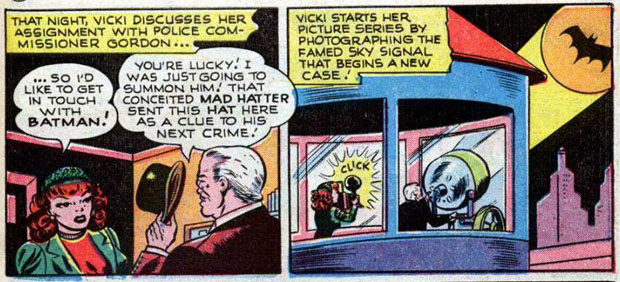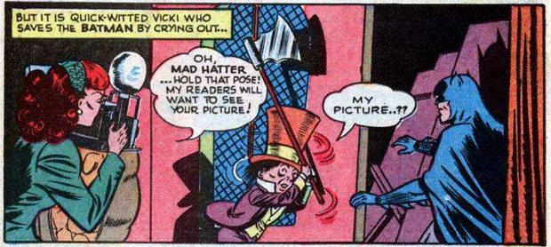 Die erste Mad Hatter-Story steckt voller Überraschungen. Die erste ist gleich auf der ersten Seite: Die Überschrift lautet „The Scoop of the Century“, aber zu sehen ist nicht der Verrückte Hutmacher, sondern die Fotografin Vicki Vale, wie sie zu beweisen versucht, dass Batman und Bruce Wayne dieselbe Person sind. Das ist der Spannungsbogen der Story, während der Mad Hatter nur kurioses Beiwerk ist. Aber genau das macht die Geschichte interessant.