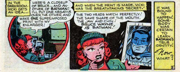 Obwohl Vicki ihren Scoop hat, will sie noch einen Beweis. Als Batman und Robin sie (mit verbundenen Augen) in die Bathöhle führen, bringt sie ein Pulver auf Batmans Handschuh an, das im Dunkeln leuchtet. Wenn sie später Bruce Waynes Hände sehen würde, wüsste sie Bescheid.