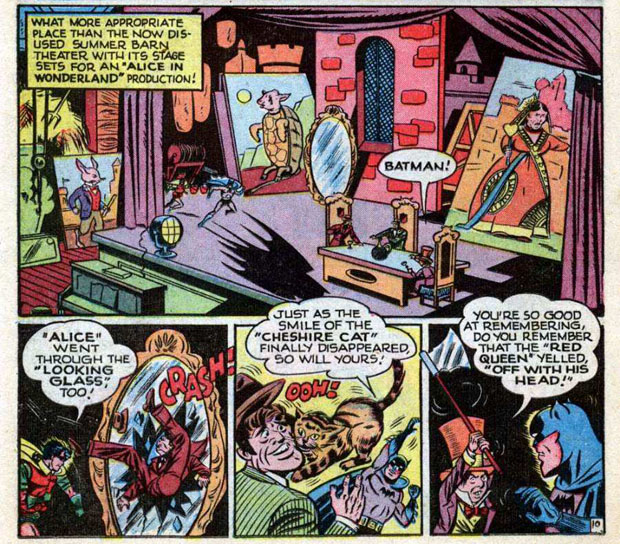 Batman findet im Labor winzige Spuren von Heu auf dem Hut des Hatters. Für den leser heißt das: Er könnte überall sein. Einziger möglicher Schluss für Batman: Der Hatter versteckt sich in einem Scheunentheater, in dem gerade Alice im Wunderland gespielt wird. Dort sitzen die Gauner dann tatsächlich auf der Bühne zusammen. (Wo sind die Schauspieler? In der Mittagspause?)