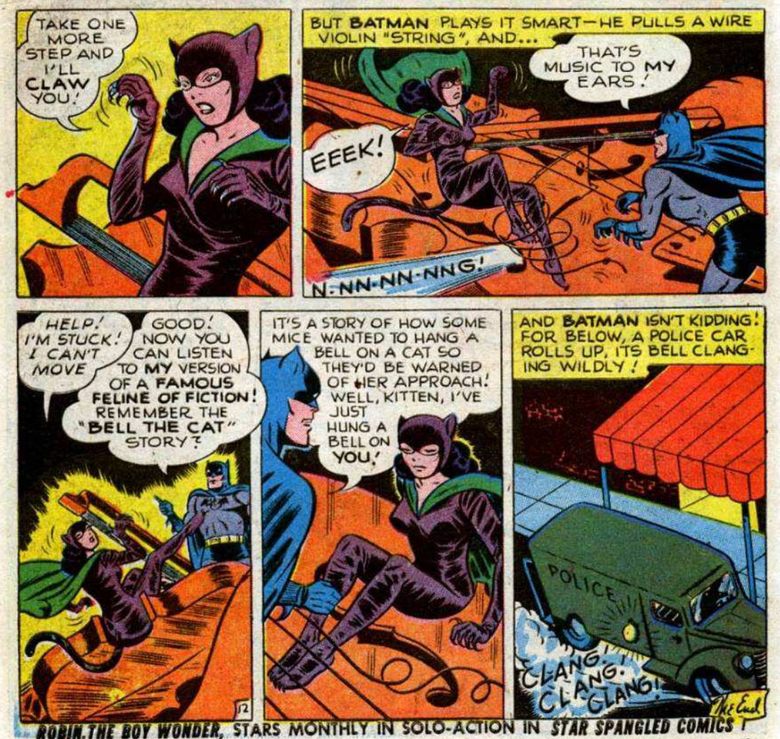 Dank eines explosiven Buchs bricht sie (wieder) aus dem Knast aus, dann leitet sie jeden Raub mit einer Referenz auf berühmte Katzen ein: Zehn kleine Kätzchen hängen am Baum und lenken einen Polizisten ab, während sie Juwelen raubt, beim zweiten Mal gibt es gestiefelte Katze beim Rodeo – Batman und Robin legen eine Show hin, die die Menge jubeln lässt.