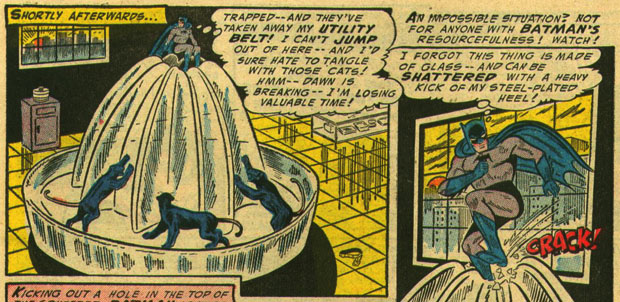 Kein Witz. In einer Messe für Haushaltswaren stellt sie Batman auf eine Riesensaftpresse und setzt drei Panther darunter. Sie können nicht rauf, er kann nicht runter. Was tun? Batman tritt die Presse aus Glas mit seinem Stiefel ein und flieht durch das Loch.