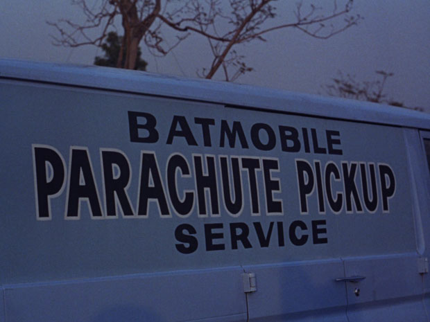 Batman und Robin machen mal wieder ihre berühmte Kehrtwende mit dem Fallschirm im Batmobil. Aber was passiert eigentlich mit dem Fallschirm auf der Straße? Robin ruft den „Batmobile Parachute Pickup Service“ und schon braust ein Bulli los, der offenbar den ganzen Tag lang nur herumsteht und auf diesen Moment wartet, um den Schirm einzusammeln. Da gehen also Waynes Millionen hin …