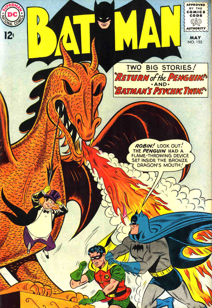 Zunächst lockt er Batman und Robin mit einem chinesischen Bat-Signal nach Chinatown, wo er eine Drachenstatue Feuer speien lässt, dann jagt er ein paar Adler auf sie und entkommt auf einem Strauß. Doch das ist nur das Vorspiel; danach fährt er schwerere Geschütze auf: Ein Pinguin-Luftschiff und mechanische Riesenvögel. Der Pinguin trickst Batman aus, indem er ein Ballon-Double von sich schweben lässt. Bruce Wayne und andere Freunde von in Gotham bekommen Pinguine geschickt und am Ende springt der Pinguin aus einem riesigen Kuchen, begleitet von einem Schwarm Krähen.