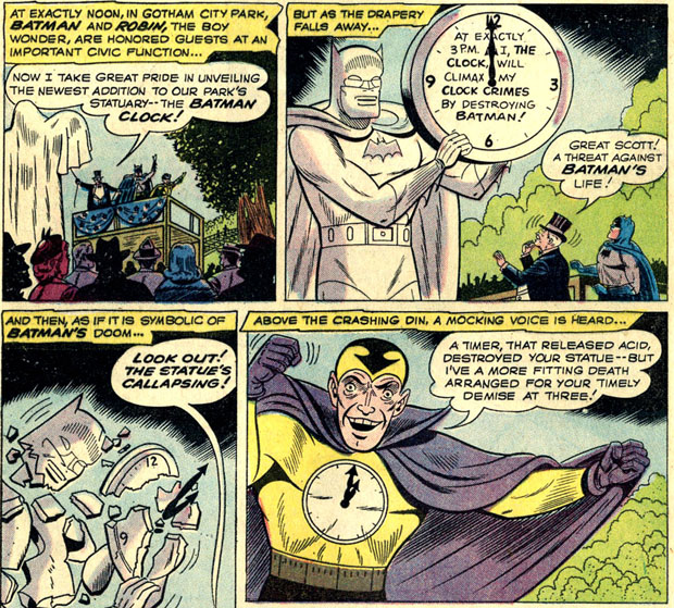 Der Uhren-Schurke wird für Batman Anlass zu einer Zeitreise: Denn in dieser Ausgabe wird auf einer Seite erneut Batmans Entstehungsgeschichte nacherzählt. Danach wird Batman als Anfänger dargestellt, der zwar Fehler macht, aber schon die nötigen Fähigkeiten hat, um den gewieften Dieb zu fassen. So eskapistisch das Silver Age scheint, geschichtsvergessen ist es nicht, denn gerade in den 50ern erfahren wir immer mehr über Batmans Vergangenheit (z.B. dass sein Vater, Thomas Wayne, der erste Batman war und Bruce als Robin anfing).