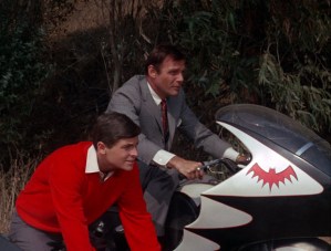 Trotzdem gibt die Folge einige Höhepunkte her: Bruce und Dick kaufen Unterwäsche für Tante Harriet, Bruce versucht eine Kuh von der Straße zu ziehen und als Bruce sein Auto von Shame stehlen lässt, kommt das Batcycle per Fernsteuerung angefahren, Bruce überreicht Alfred ein zusammenfaltbares Fahrrad und auf diesem „Alf-Cycle“ fährt er davon. Bruce und Dick steigen in zivil auf das Batcycle, ohne sich darum zu sorgen, dass jemand sie sehen könnte. Hier fällt der Unterschied zwischen den Rollen auf: Wenn Bruce das Kostüm nicht trägt, redet er ganz ruhig und ohne Pathos, ja man könnte ihn fast schon cool nennen. Ein Jammer, dass Adam West nie James Bond gespielt hat.