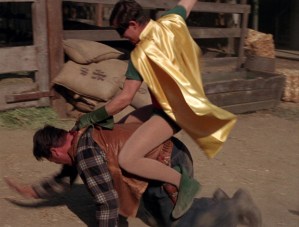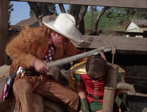 Beim typischen Western-Showdown treten Batman und Robin ihrem Gegner ohne Waffen gegenüber. Natürlich zu High Noon. Und um auch das letzte Klischee zu erfüllen, fällt der Satz „This town ain’t big enough for both of us.“ Batman ist sich sicher: Shame würde nie auf einen Unbewaffneten schießen, das verstieße gegen den Western-Code. Dass sie bereits aus vollen Rohren beschossen worden sind und Robin bereits eine Kugel abgekriegt hat, scheint vergessen. Man hilft sich mit einer Rauchbombe, die Bösen schießen die Magazine leer und man kann die Sache mit Fäusten lösen. Auch dabei kommt es zu absurden Szenen, wie Robin, der auf einem Schurken Rodeo reitet …