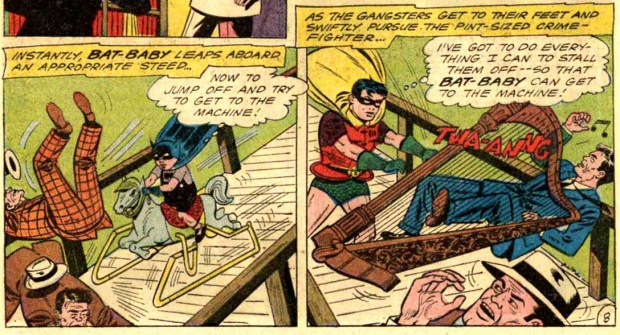 Bat-Baby und Robin spüren die Gangster auf, die Batman verkleinert haben, Bat-Baby knockt sie mit einem Schaukelpferd aus und Robin mit einer Harfe – man nimmt, was eben zur Hand ist. Die Bösen sind so baff, dass sie einfach umfallen. Und plötzlich ist Batman wieder ganz der Alte. Zum Glück hatte er ein zusammenfaltbares Plastikkostüm dabei.