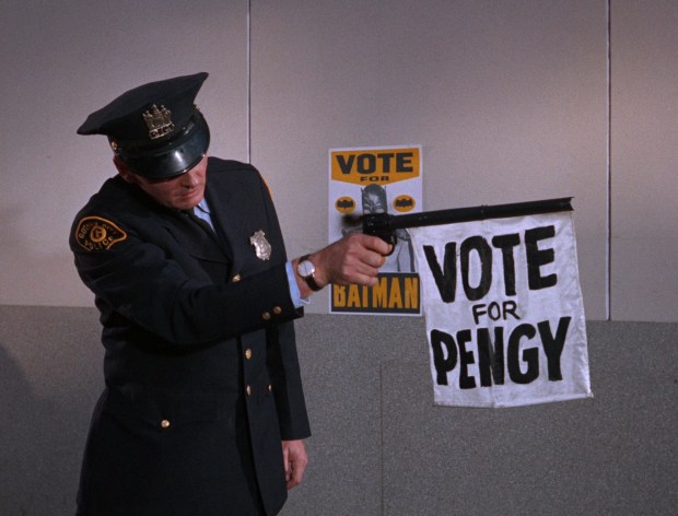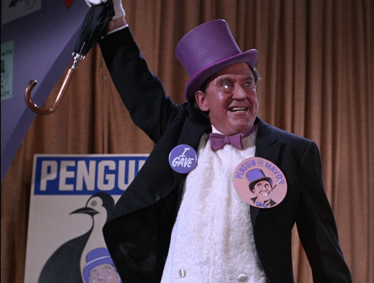 Aber Batman bleibt bei seinem Idealismus und hält lieber Reden über Inhalte. Reden, zu denen kaum jemand kommt und die Anwesenden einschläfert. Ein begnadeter Rhetoriker ist er leider nicht. Es hilft auch nicht, als er aus hygienischen Gründen keine Babys küssen will. Der Pinguin wirbt ihm Wähler ab, lässt eine Bauchtänzerin und eine Rock-Band auftreten (Paul Revere and the Raiders!). Der Mann weiß einfach, was dem Volk gefällt.