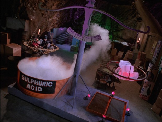 Um ganz sicherzugehen, lockt er Batman und Robin trotzdem in eine Todesfalle. Sie hängen in einer Waagschale über Schwefelsäure, auf der anderen Seite schmelzen Eisbrocken. Wie gut, dass Batmans Anzug zufällig säureresistent ist …