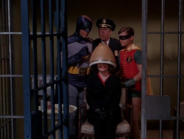 Normalerweise ist dieser Unsinn unterhaltsam. Aber leider steht diese Szene für die ganze Doppelfolge, die unter Lähmungserscheinungen leidet. Bis auf zwei riesige Gummispinnen hat sie nicht viel zu bieten. Weder Witz noch Action. Nur ganz am Ende wird Batman plötzlich proaktiv. Und das auf sehr seltsame Weise: Mit seinem umgemodelten Brain-Wave Bat-Analyzer, der nichts anderes ist als eine aufgemotzte Trockenhaube, verändert er im Knast die Gehirne von Black Widow und ihren Handlangern, um sie zu „ehrlichen und nützlichen“ Bürgern zu machen. Kurz gesagt: Gehirnwäsche.