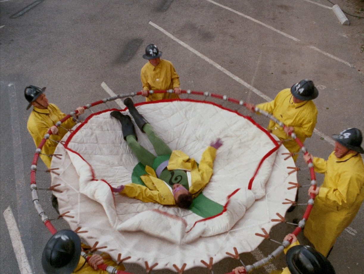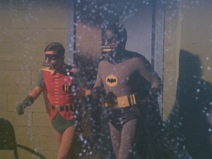 Batman und Robin müssen Kreuzworträtsel und andere schwierige Situationen lösen. Zum Beispiel eine Prügelei unter Wasser. Der Riddler flutet einen Tresorraum und lädt das Geld in einen wasserdichten Sack. Fragt sich nur, was der nützt, wenn man ihn unter Wasser öffnet, um das Geld reinzustecken. Als das Dynamische Duo auftaucht (oder vielmehr abtaucht), muss es die Gauner in Slow Motion aufhalten. Die Szene ist natürlich nicht unter Wasser gedreht, sondern nur mit billigen Spezialeffekten. Aber dabei zuzusehen, wie alle nur so tun, als wären sie unter Wasser, ist eine spaßige Abwechslung in der Batman-Routine.