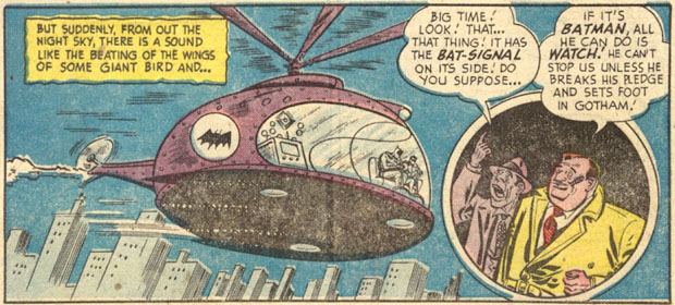 Denn er weiß, was kommt: Die Bande plant, in dieser Woche Sturmfrei mächtig Reibach zu machen. Da Batman die Stadt nicht betreten darf, baut er sich schnell eine fliegende Bathöhle zusammen. Von dort aus kann er die Verbrecher verfolgen, ohne einen Fuß in die Stadt zu setzen. Mit einem Magneten beraubt er die Gauner ihrer Waffen und liefert sie so der Polizei von Gotham aus (ja, dafür scheint sie noch gut zu sein).