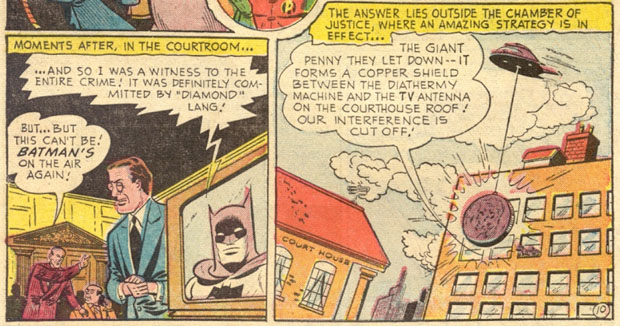 Batman hat in seiner fliegenden Bathöhle sogar den Riesenpenny eingepackt – aus reiner Sentimentalität, um sich ein wenig heimischer zu fühlen. (Die mindestens eine Tonne Gewicht scheint die Flugfähigkeit nicht zu beeinträchtigen.) Und die Münze erweist sich sogar als ziemlich nützlich, als Batman per TV-Schalte vor Gericht gegen einen Verbrecher aussagen soll und die Komplizen das Signal blockieren, hält der Riesenpenny die Störung vom Gerichtssaal fern.