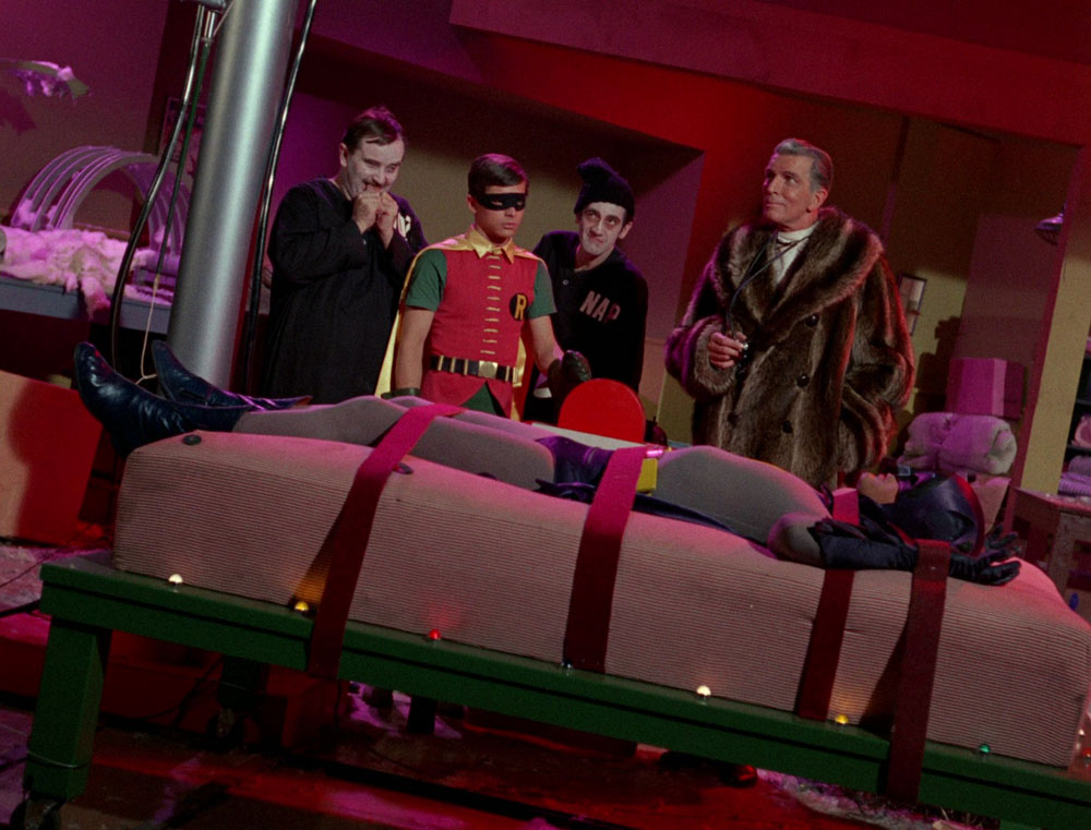 Die Todesfalle: Nach einer Kissen- und Matratzenschlacht wird wird an eine Matratze gefesselt und soll von einer Maschine, die Knöpfe annäht, getötet werden, aber er hilft sich selbst, indem er mit dem Bat-Gürtel den Schalter umlegt. In der Zwischenzeit schickt Catowman Robin mit einer Undercover-Polizistin durch ein sinnloses Labyrinth mit Hochspannungszäunen.