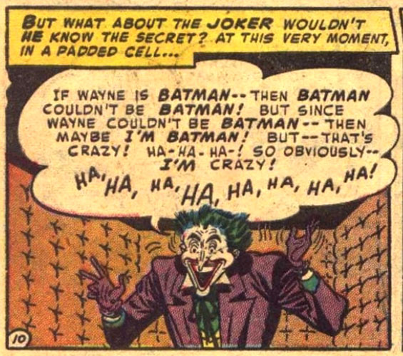 Der Joker will abhauen, da hört er Batman herbei eilen. Er zweifelt an seinem Verstand, schaut in der Zelle nach – und da sitzt Bruce Wayne und gibt sich für Batman aus. Ein gewagtes Manöver, aber der Joker fällt drauf rein. Zumindest vorübergehend denkt er, er sei verrückt geworden. Als dann auch noch ein Mann im Batman-Kostüm auftaucht und sich auf Bruce Wayne stürzt, den er für den Joker hält, dreht der Joker wirklich durch.