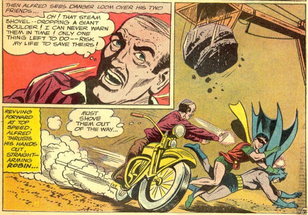 Batman und Robin landen in einer Zelle, Alfred steckt auch schon in einer, aber sie wissen nichts voneinander. Sie befreien sich unabhängig voneinander, finden ihre jeweils leeren Zellen vor, gehen vom Schlimmsten aus und fahren aneinander vorbei zu dem Schauplatz des nächsten Raubes. Die Gang will einen alten Schatz ausgraben. Kaum sind sie da, fällt aus einem Bagger ein riesiger Felsbrocken auf das Dynamische Duo, Alfred kommt mit dem Motorrad angerast und rettet sie, kommt dabei aber selbst zu Tode.