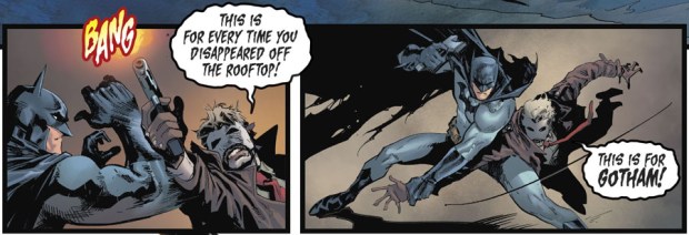 Als Gordon ein paar Jahre später zu einem Schurken gemacht wird (Batman/Superman #1-6, 2019), lässt er seine ganze Wut an Batman aus, die sich über die Jahre aufgestaut hat: „This is for every time you disappeared off the rooftop!“, schreit er, als er Batman erschießen will.