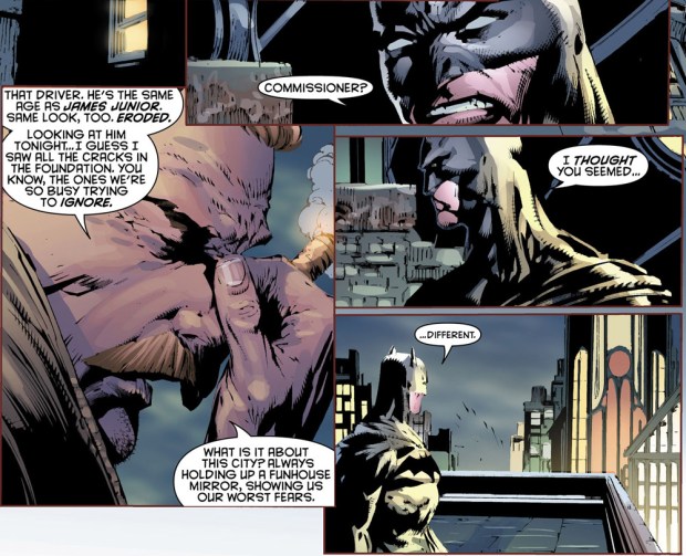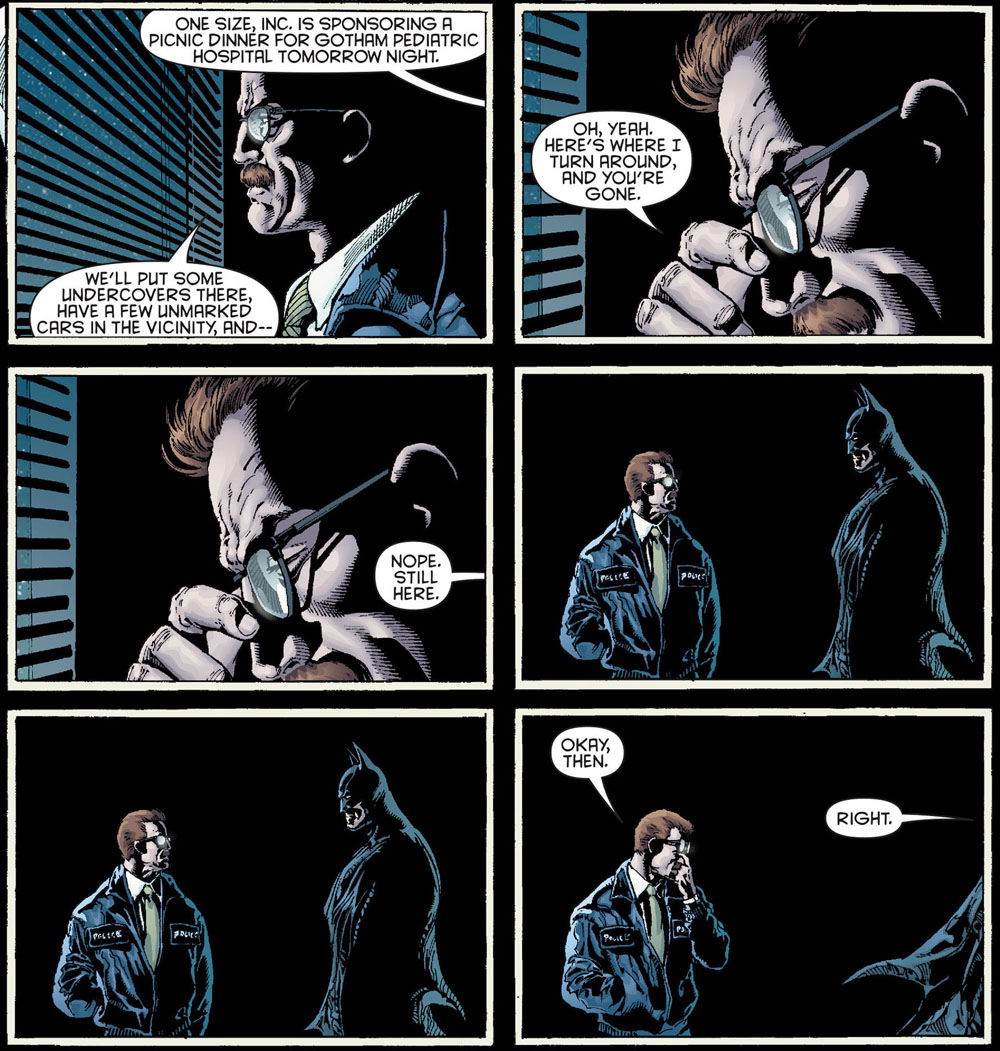 So strapaziert er am meisten Commissioner James Gordons Geduld. Der arme Mann lässt sich auf eine Zusammenarbeit mit ihm ein, obwohl es ihn in ein Dilemma mit dem Gesetz bringt, und immer wieder lässt Batman ihn mitten im Satz stehen, vorzugsweise auf dem Dach des Polizeipräsidiums, beim Bat-Signal. Diese Batman-Tradition ist alt, kam aber erst in den Comics der 70er-Jahre auf (Detective Comics #424, 1972, dann Swamp Thing #7, 1973). Dort nimmt ihm Gordon das Verschwinden nicht übel, weil es so scheint, als wolle Batman einfach nur keine Zeit bei der Ermittlung verschwenden.