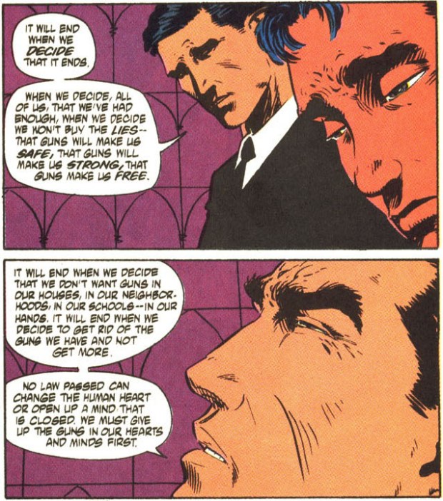 Batman hält aus Erfahrung nichts von Schusswaffen, da er als Kind seine Eltern durch eine verloren hat. Er hält daher auch nichts von der Binsenweisheit, dass Menschen töten und nicht Waffen. Denn ohne eine Waffe hätte der Mörder auch nie seine Eltern töten können. Sein Appell: Es endet erst, wenn wir entscheiden, es zu beenden.