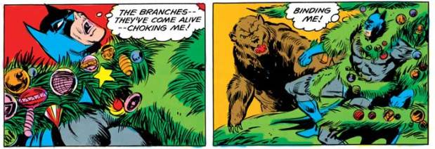 Batman in den Fängen eines Weihnachtsbaums – und eines Bären. (DC Comics)
