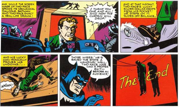 Batman kommentiert nur zynisch: „He’s saved the state a hanging! Well, Two-Face has had a proper exit – before an audience!“ Man kann aber nicht leugnen, dass damit Bill Finger ein passendes Ende für den Schauspieler gefunden hat – wenn auch ein tragisches, denn Vorgänger Harvey Kent wurde (zumindest zwischenzeitlich) geheilt.