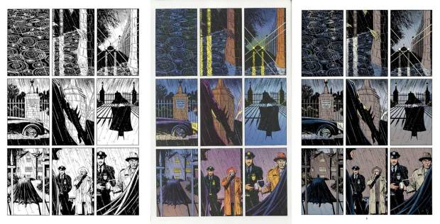 Durch diese Nahaufnahme sehen wir nicht, wo wir sind. Wir erfahren es erst nach und nach. Hier wird Spannung aufgebaut, indem Informationen erst langsam, geradezu tropfenweise geliefert werden. Erst das zweite Bild deutet eine Mauer an, wir sehen drei Blätter fallen, es könnte Herbst sein (laut Moores Skript November). Zwei Lichtstrahlen fallen auf die Pfütze. Im dritten Panel wird klar, woher das Licht kommt: Von den Scheinwerfern des Batmobils, das aus der Ferne angefahren kommt. Nun sehen wir, dass die Mauer Teil eines Zauns ist.