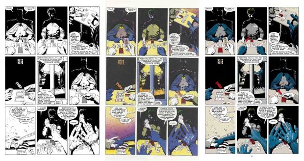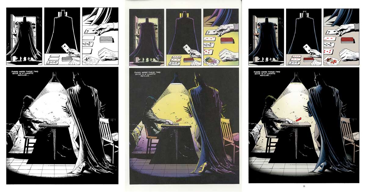 Der Joker antwortet wieder nicht, Batman greift nach Jokers Hand. Er verstehe nicht, warum ihre Beziehung tödlich verlaufen sollte, er wolle seinen Mord nicht an seinen Händen haben. Da fällt Batman die weiße Farbe an seinem Handschuh auf, während sich der Joker ans Handgelenk greift. (Hier ergibt die Schwarz-Weiß-Fassung keinen Sinn, da man die weißen Spuren nur in den Farbversionen sieht.)