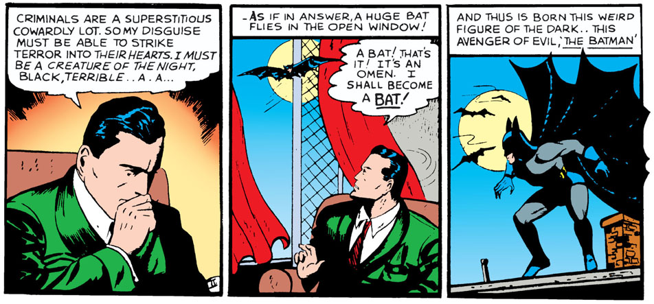 Das Bild zeigt allerdings das Cover von Detective Comics #27, Batmans Premiere. Er hält einen unbekannten Mann im Schwitzkasten, während er sich mit dem anderen Arm von einem Gebäude zum anderen schwingt. Hier weicht Bolland von Moores Skript ab, der sich ein Zitat des letzten Panels aus Batmans erster Origin-Story gewünscht hat.