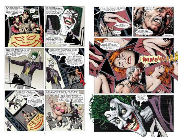 Während Gordon sich krümmt wie der junge Mann zuvor und wegschauen will, aber dazu gezwungen wird, sich aufzurichten, singt der Joker ein Lied auf den Wahnsinn als Eskapismus und konfrontiert Gordon mit den Bildern seiner nackten, verwundeten Tochter, die sich vor Schmerzen krümmt und weint.