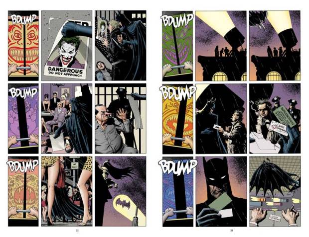 Statt noch mehr mit dem Horror, den Gordon durchmacht, konfrontiert zu werden, sehen wir parallel dazu, wie Batman ermittelt. Jede geöffnete Tür leitet eine neue Station ein: Batman reißt ein Fahndungsplakat, das den Joker zeigt, von einer Wand ab und präsentiert es möglichen Zeugen und Informanten. Aus Storysicht macht das Zeigen des Plakats keinen Sinn, denn der Joker dürfte stadtweit bekannt sein, aber es folgt der Logik einer sprachlosen Bilderzählung. Dadurch wissen wir, was Batman da tut, ohne dass es ausgesprochen werden muss. Die Befragten scheinen selbst sprachlos zu sein, sie wissen anscheinend auch nicht weiter. Batman nutzt Gewalt und Einschüchterung, er sucht einen Gangsterboss und den Pinguin auf, schließlich befragt er Prostituierte – alles ohne Ergebnis, während Gordon weiter leidet. Der Detektiv Batman ist ratlos, er versagt.