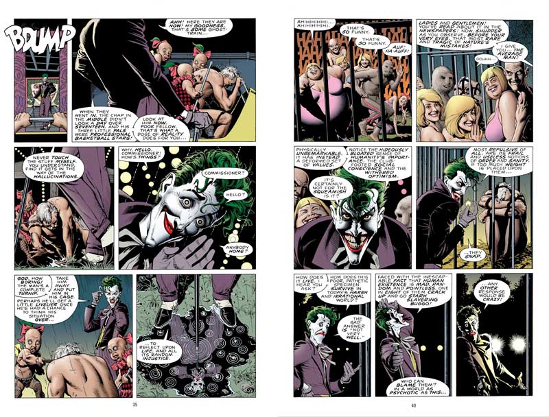 Der Joker stellt in seine Ansprache Gordon selbst als Freak dar, als „average man“, der zwar von außen makellos erscheint, aber deformierte Wertvorstellungen in sich trägt: „Notice the hideously bloated sense of humanity’s importance. The clubfooted social conscience and the withered optimism. Most repulsive of all, are its frail and useless notions of order and sanity.“ Diese Vorstellungen sind schwach, denn bei zu großer Belastung brechen sie.