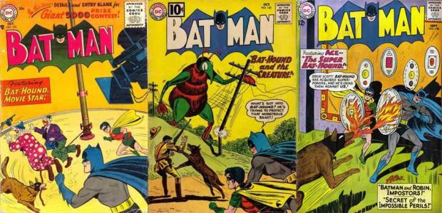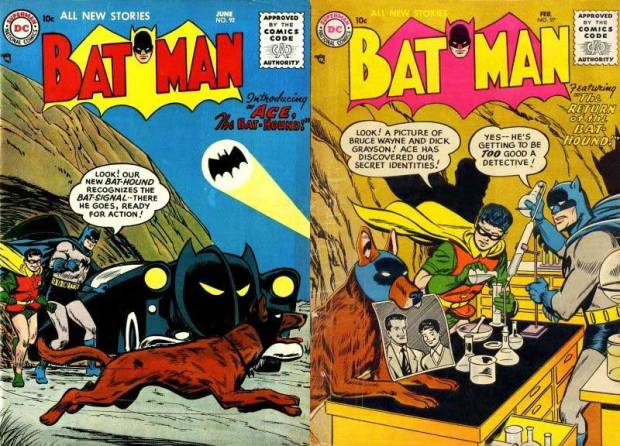 Erst kurz zuvor hatte Superman (bzw. genauer: Superboy) seinen Krypto bekommen, einen weißen Hund mit rotem Cape (Adventure Comics #210, 1955). Und was Superman hatte, das musste früher oder später auch Batman kriegen. In diesem Fall sofort: Ace the Bat-Hound (geschaffen von Bill Finger und Sheldon Moldoff) war ein Deutscher Schäferhund mit einer schwarzen Maske und kleinem Fledermaus-Anhänger. Zwar haben Hunde keine Gesichter wie Menschen und auch keine Doppelidentitäten, aber irgendwie muss sich der Bat-Hund ja von einem normalen unterscheiden. Wenn man noch mehr darüber nachdenkt, wird es kurioser: Ein Fledermaus-Hund ist an sich eine bizarre Vorstellung, die eigentlich eine Chimäre hervorbringen müsste. Andererseits kennt die Biologie auch „Flughunde“ als Verwandte der Fledermäuse. (Im Englischen heißen sie „Flying foxes„, um die Sache noch zu verkomplizieren.) Das wäre vielleicht das passendste Haustier für Batman: ein dressiertes Fledertier. Aber darauf kommt erst Frank Miller in Year One. (Tatsächlich kann aber Batman Ace mithilfe eines Senders im Stiefelabsatz anlocken – wie später den Fledermaus-Schwarm.)