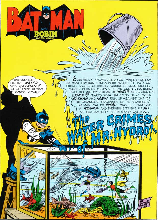 Also lässt er den Wasserturm an der Knastmauer umknicken und sich mit dem Wasserfall in die Freiheit spülen, dann wird er zum Superschurken Hydro, samt blauem Helm und gelbem Anzug – fast sieht er aus wie ein Taucher (wenn der Mund nicht freiläge). Und wider Erwarten ist er damit zunächst sehr erfolgreich. Während er einen Banksafe mit „schwerem Wasser“ knackt, halten seine Komplizen Batman und Robin mit einem Wasserschlauch auf. Später entkommt er, indem er aus dem siebten Stock in ein Planschbecken springt. (Batman will hinterher, aber der Schurke zersticht es.) Hydro will dann einen Damm sprengen, dann stößt er eine Frau in einen Fluss und lässt fast ein paar Wasserballett-Tänzerinnen ertrinken, um von seinem nächsten Raubzug abzulenken.