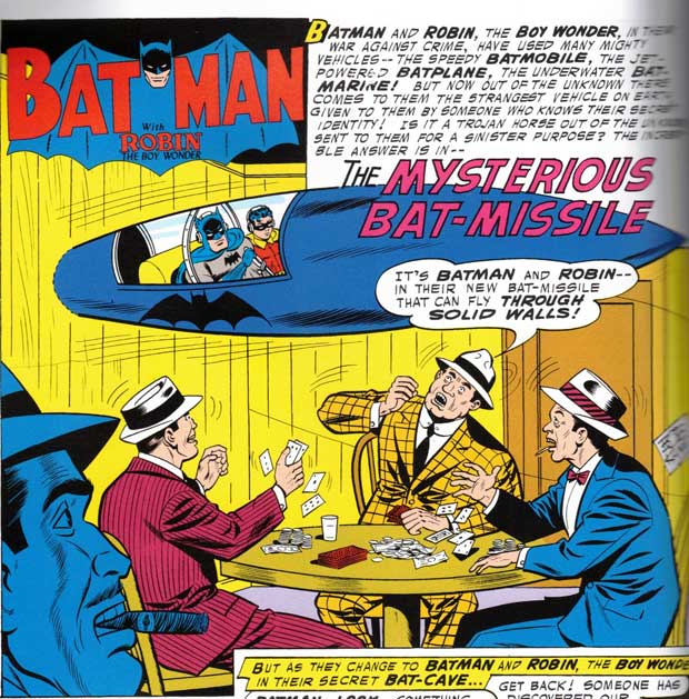 Die bizarrste Maschine, in der Batman unterwegs ist, ist eine Rakete: die Bat-Missile. Als Batman und Robin gerade einen Gangster suchen, taucht sie aus dem Nichts in Bathöhle auf. Sie dringt durch die Höhlenwand, ohne sie zu durchbrechen, und trägt ein Fledermaussymbol. Das Dynamische Duo hat keine Ahnung, was das soll, steigt aber ein und fliegt auch sofort los, sobald die Polizei nach ihnen ruft. Die Rakete fliegt von selbst. Und sie dringt auch geisterhaft durch Hindernisse wie Gebäude.