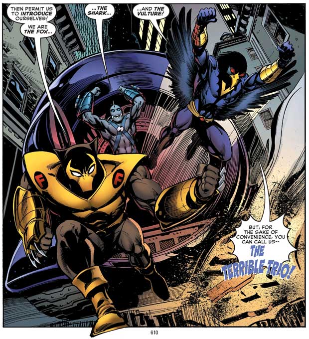 Schließlich gibt es ein Widersehen in DC Retroactive: Batman-The ’70s (2011). In diesem seltsamen Nostalgie-Comic, das in den 70ern spielt, erscheint ein neues Terrible Trio, das mit Hilfe von hochentwickelten Maschinen die High Society ausraubt. Einer von denen ist Timothy Fox, der missratene Sohn von Lucius Fox. Allerdings steckt er nicht wie erwartet hinter der Fuchsmaske, sondern verkleidet sich als Geier. Warum? Das wird leider nicht erklärt. Wahrscheinlich ist es nur ein spätpubertärer Akt der Rebellion gegen den Vater. Auch woher die drei die Mittel und das Know-How für die Maschinen haben, bleibt ein Rätsel.