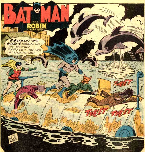 Nächstes Verbrechen: Im Hafen, mit dressierten Delfinen, die Druckplatten für Falschgeld schmuggeln. Die Delfine stoßen auf Befehl Batman und Robin ins Wasser. Doch was hat der Fuchs vor? Irgendwas mit Menschenschmuggel … Sie helfen anderen Knastausbrechern bei der Flucht. Etwa Archie Craig. Der Fuchs bringt ihn mit seinem Erdbohrer in Sicherheit. Batwoman wird darauf aufmerksam und folgt ihnen. Doch Craig ist in Wahrheit Batman in Verkleidung. Als er im Versteck des Trios auffliegt, jagen die Gauner ihn mit Robin in Raketen ins All (damit sie später nicht wegen Mordes angeklagt werden können). Doch zum Glück ist da noch Batwoman mit ihrem Haarnetz …