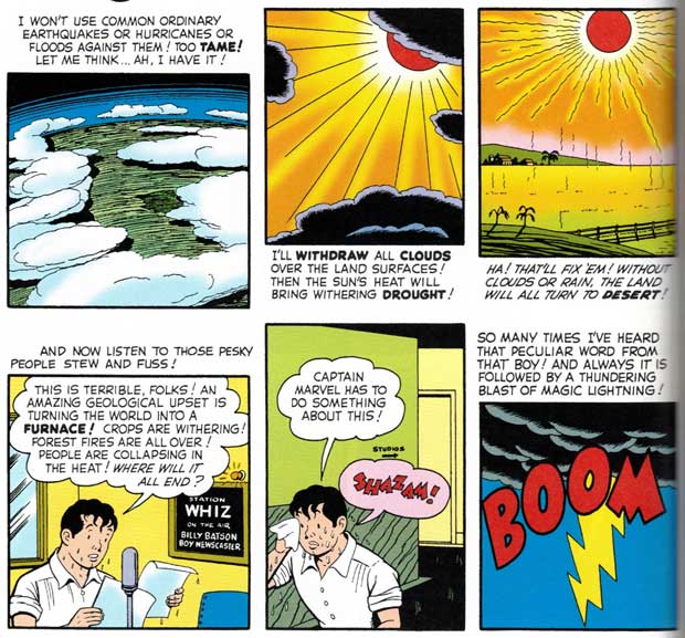 Captain Marvel kommt noch nicht auf die Idee, dass die Ursache beim Menschen liegt. Erdöl ist in den 50ern noch unverdächtig und Symbol des wachsenden Wohlstands. Doch auch er sieht, dass er diesen scheinbaren Gegner nicht wie einen Schurken behandeln und einfach kaputtprügeln kann. Also versucht er sich darin, das Wetter zu beeinflussen. Er holt einen Asteroiden aus dem All und erschafft aus dem Eis Wolken. Die Hitzewelle ist vorüber. Die Erde rächt sich, indem sie Eisberge gegeneinander knallen lässt, dadurch entstehen Vibrationen, die Häuser zum Einsturz bringen. Captain Marvel steckt ein Kissen zwischen die Eisberge – Problem gelöst. Dann fährt die Erde das schwerste Geschütz auf: Sie löst Südamerika aus ihren Angeln und versucht, den Kontinent gegen Nordamerika prallen zu lassen. Unser Held kann auch das mit Muskelkraft verhindern.