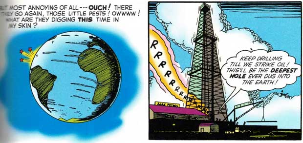 Vor 70 Jahren erschien eine kleine, harmlose Comicstory mit einer verrückten Idee: Captain Marvel (heute „Shazam“) kämpft gegen die Welt. Gemeint ist: der Planet Erde, der hier eine eigene Persönlichkeit erhält und seine Geschichte erzählt. Die Erde wird geplagt von den Menschen, die nach Öl bohren und ihr damit weh tun, denn die ganzen Löcher dringen in ihre Haut. Der Planet rächt sich, indem er die Wolken verschwinden lässt. Dadurch scheint ungehindert die Sonne und sorgt für eine unerträgliche Hitzewelle und Dürre.