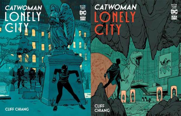 Cliff Chiang (Wonder Woman, Paper Girls) erzählt uns eine Story, die wie das Catwoman-Pendant zu The Dark Knight Returns wirkt, aber sich auch bei Citizen Kane bedient („Orpheus“ = „Rosebud“) und eine Prise V for Vendetta in sich trägt (z.B. die Menge mit den Grinsekatzenmasken). Bei aller Dystopie und Melancholie hat Lonely City aber eine gewisse Leichtigkeit, auch dank der freundschaftlichen Beziehungen, die Selina zu ihren Mitstreitern pflegt. Killer Croc ist zwar etwas zu tumb, aber liebenswert, der Riddler ist zum ersten Mal sympathisch, ebenso Poison Ivy, die hier ausnahmsweise keine Idealmaße hat.