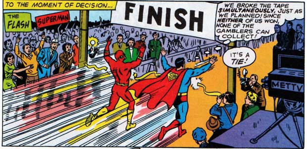 Flash und Superman befreien sich und laufen dann gleichzeitig im Ziel ein. Doch das ist Absicht. Die beiden haben sich abgesprochen, damit keine Bande die Wette gewinnen kann. Damit haben sie im Grunde auch betrogen. Aber hier heiligt der Zweck die Mittel. Außerdem steht keiner als Verlierer da. Sehr diplomatisch.