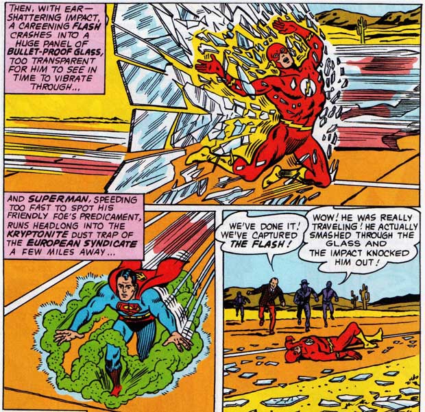 Damit es etwas spannender wird, gibt es Gauner. Zwei konkurrierende Banden haben Wetten abgeschlossen: eine Milliarde Dollar auf Flash bzw. Superman. Weil es um so viel Kohle geht, die beide Banden ruinieren könnte, wollen diese tricksen. Wie der Kojote aus den Roadrunner-Cartoons stellen sie Fallen auf: eine Scheibe aus Panzerglas für den Flash, eine Ladung Kryptonitgas für Superman. (Wo sie das herkriegen? Kryptonit ist damals eigentlich überall, sogar Vulkane speien es.) Dann lassen sie Doppelgänger in Kostüme der Helden sowie Raketenstiefel schlüpfen, damit diese zwar schnell sind, aber absichtlich langsamer ins Ziel laufen. Doch als die beiden Betrüger dann voreinander zum Halten kommen, fliegt die Sache auf.