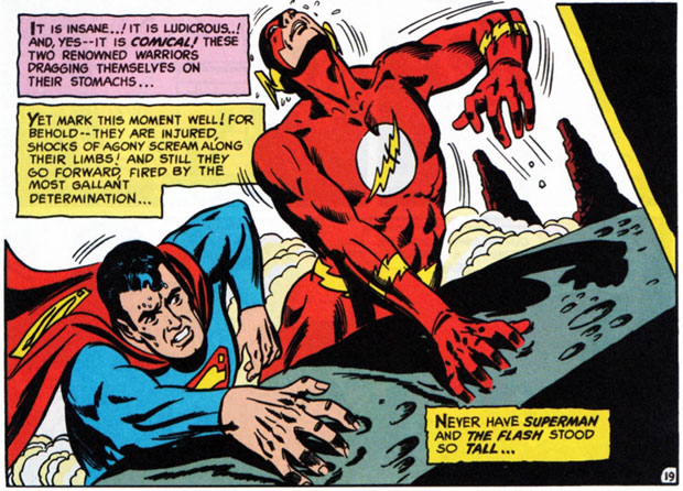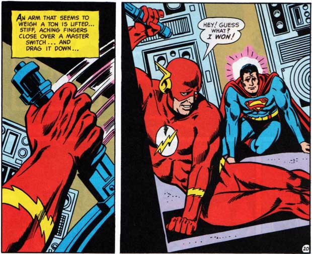 Damit hat Flash wohl das Rennen gewonnen – wenn man diesen erbärmlichen Auftritt so nennen will. Also ist Flash der schnellste Mensch der Welt? Zumindest auf dieser Welt, will Superman zugestehen … Was ein Unsympath. Man wünscht sich fürs nächste Mal, dass Flash es ihm so richtig zeigt.
